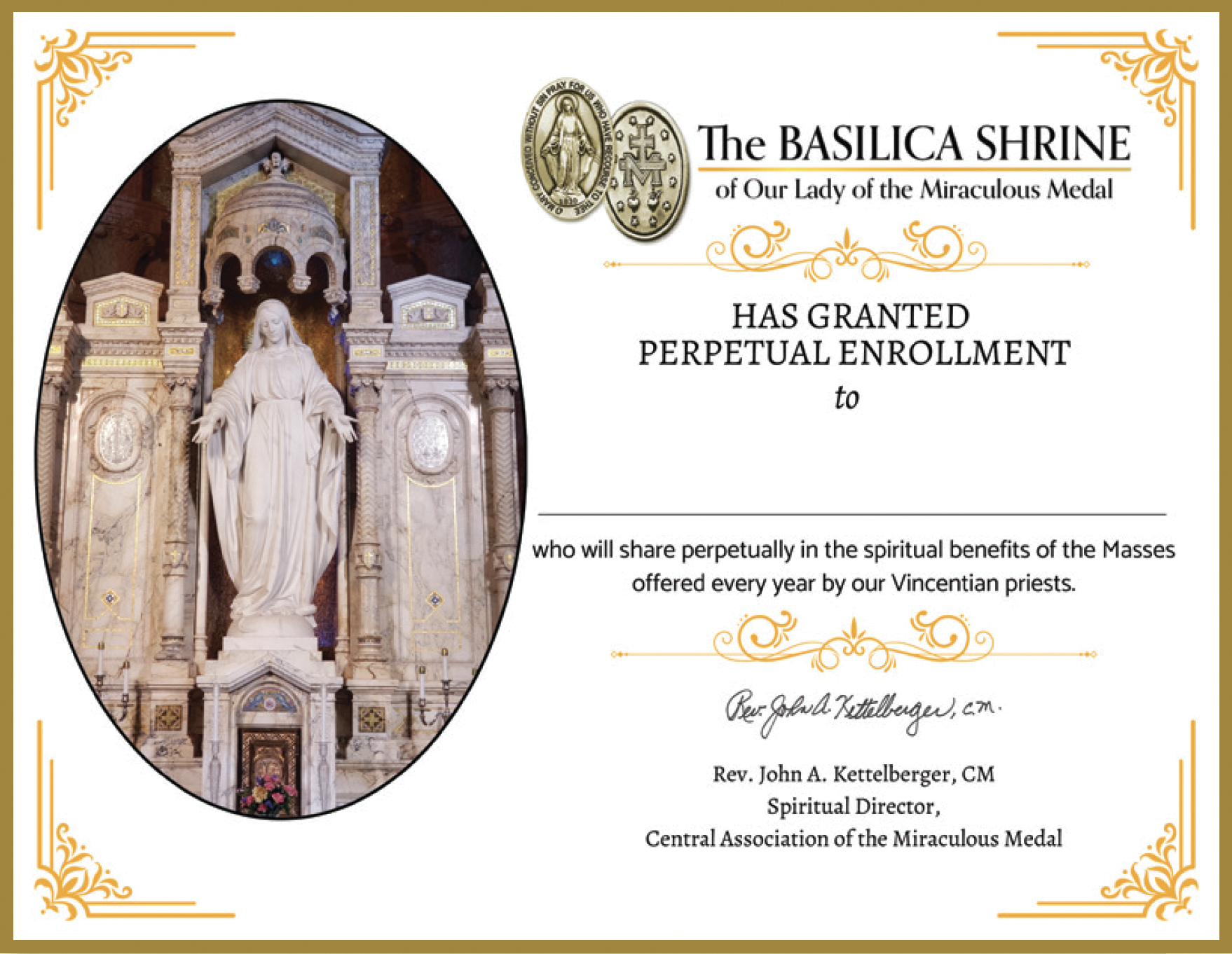 Those who believe in the true meaning of Christmas will greatly appreciate a gift of “Family Perpetual Enrollment” in our Miraculous Medal Family of Prayers. This enrollment includes all members of the immediate and extended family, both living and deceased. All share perpetually (during life and after death) in the spiritual benefits of the Masses and prayers offered by our Vincentian priests for all those enrolled.