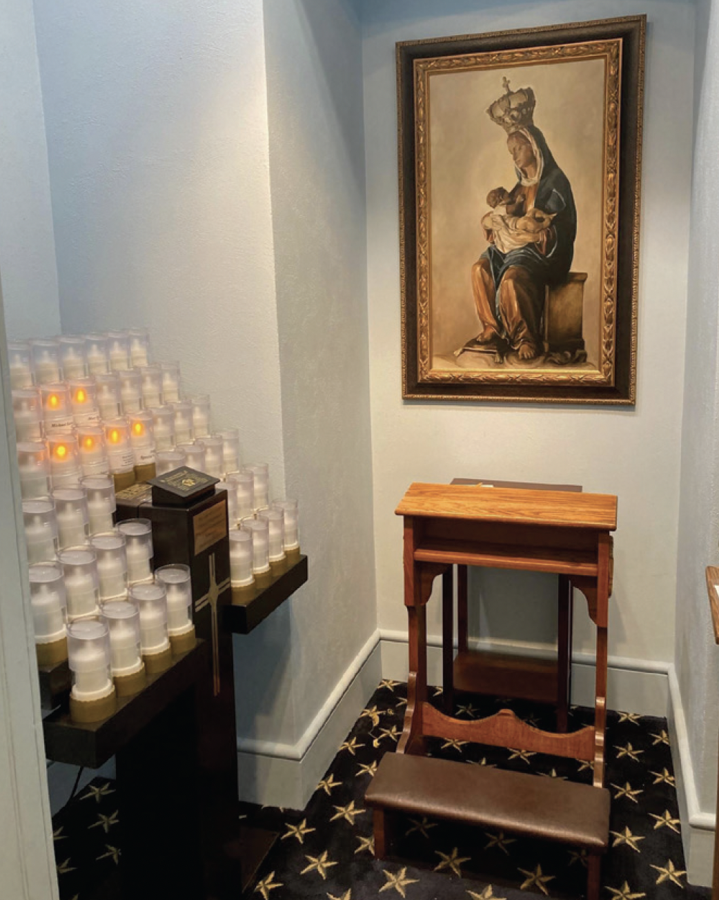 You can choose from St. Catherine or The Pieta in the upper shrine or Our Lady of Guadalupe, Vailankanni, La Leche, Fiat, St. Joseph, St. Anne, or Sacred Heart in the lower shrine.