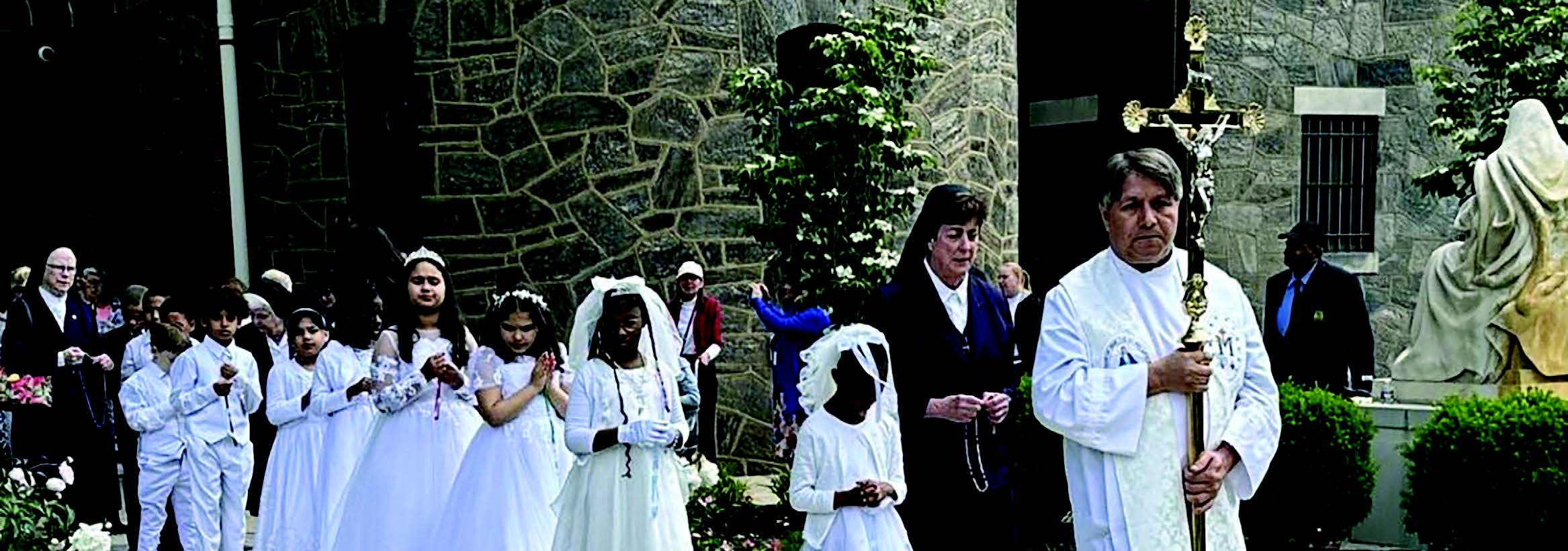 Recent First Holy Communicants from St. Francis de Sales School in West Philadelphia and St. Athanasius School in the city’s West Oak Lane section joined Fr. Abel Osario, CM, in leading the Procession along St. Vincent’s Rosary Walk outside the Basilica Shrine.